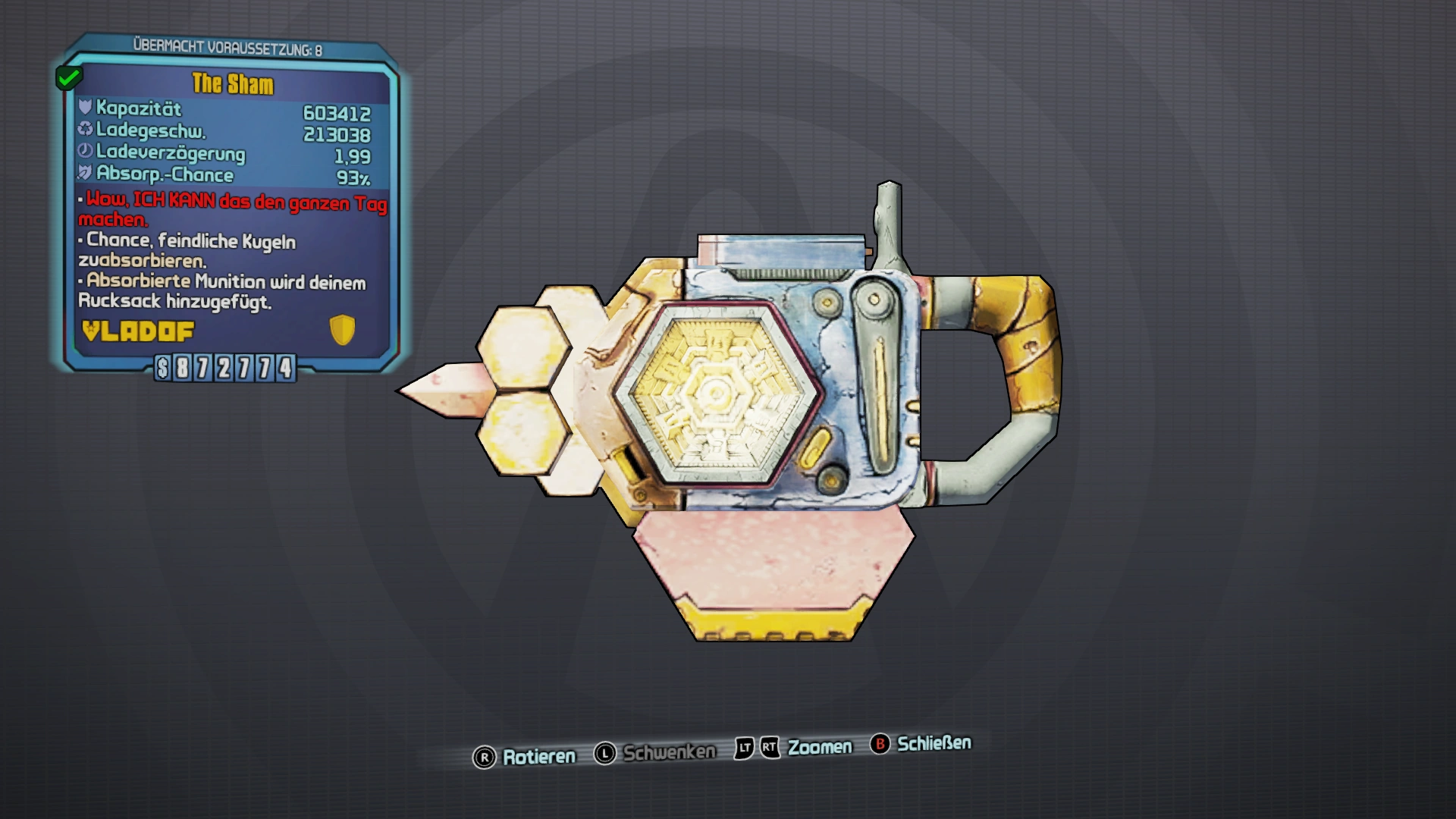 The Sham ist ein legendäres Schild hergestellt von Vladof. The Sham kann man von jeder beliebigen Beutequelle erhalten, aber der BNK3R hat eine erhöhte Chance, es fallen zu lassen.