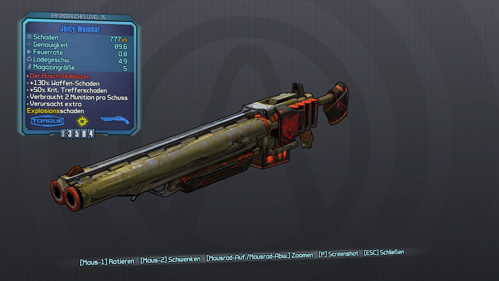 Der Busch-Bulldozer. - Die Wombat verbraucht 2 Munition pro Schuss und schießt ein Streubild in Form eines Pentagons (Fünfeck) im Bereich des Fadenkreuzes, weshalb die Wombat stets den Multiplikator x5 hat. Wenn die Projektile auf Gegner treffen, explodieren sie sofort. Treffen sie jedoch auf Objekte, dauert es ca. 6 Sekunden bis sie explodieren. Außerdem hat die Waffe noch 120% Waffenschaden und 50% kritischen Trefferschaden.
