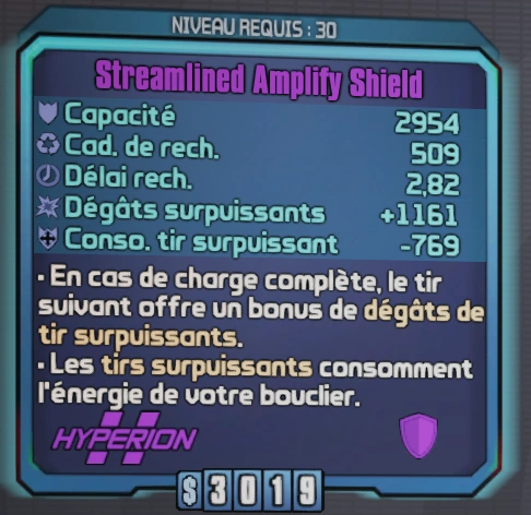 - Amplify (Hyperion) : lorsqu'il est chargé, ajoute un bonus de dégât aux tirs ;