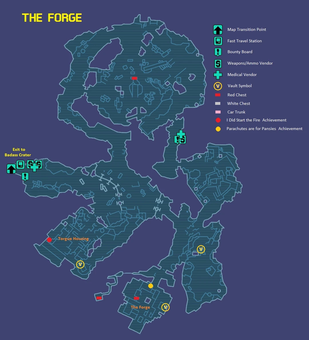 - Badass Crater Bar • Badass Crater of Badassitude • Forge • Pyro Pete's Bar • Southern Raceway • The Beatdown • Torgue Arena