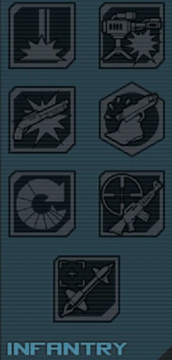 Infanterie est la première branche de l'arbre de compétences de Roland. Elle se concentre sur l'utilisation des armes et de la Tourelle Scorpio. Les deux autres branches sont Support et Médecin.