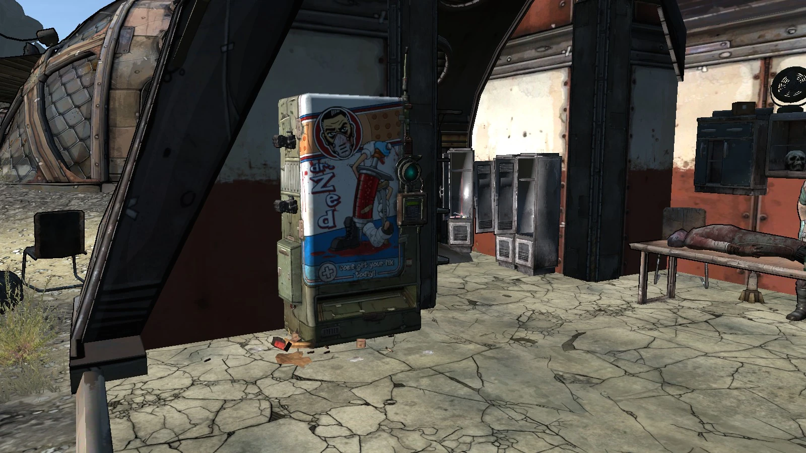 - Если собираешься покинуть город, то тебе потребуется щит. Щит защищает хозяина от повреждений. У меня есть щиты в медицинском автомате, но он пострадал при налёте бандитов. Нужен всего лишь источник энергии. Ты можешь найти его в старом разбитом автомате недалеко отсюда. Иди на восток по дороге. Когда найдёшь его, забери источник и тащи сюда. Починив автомат, ты сможешь купить себе щит.