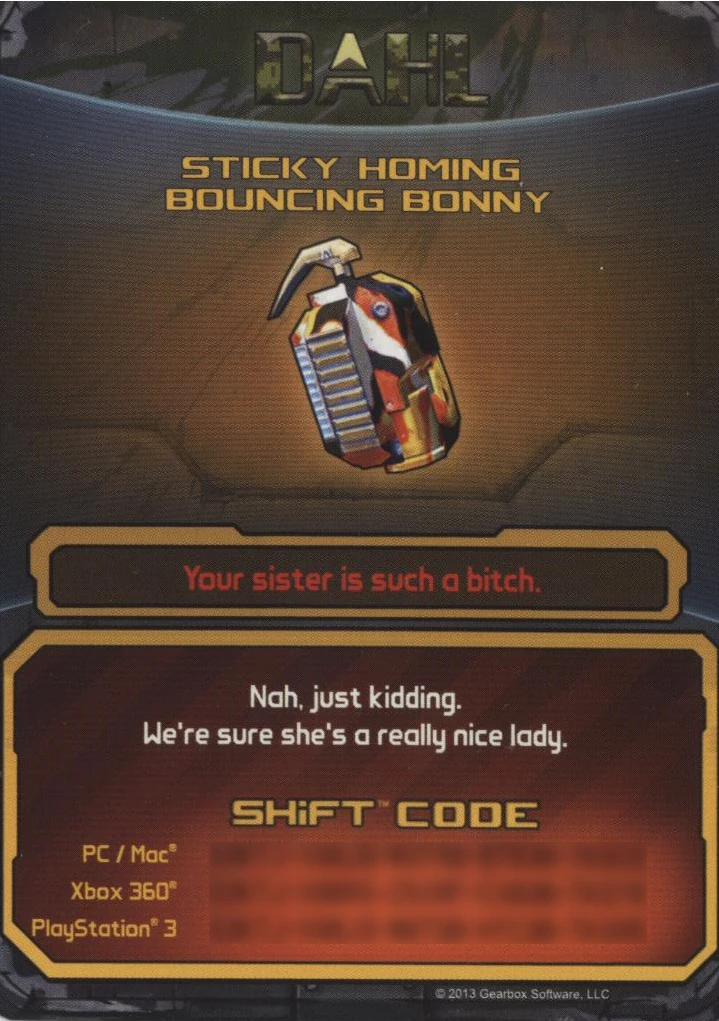 Стрибанка розблоковувалась за допомогою SHiFT-коду, який був включений до Diamond Plate Loot Chest. Напис на картці гласить: "Nah, just kidding. We're sure she's a really nice lady." (укр. "Ні, просто жарт. Ми впевнені, що вона дуже хороша леді.")