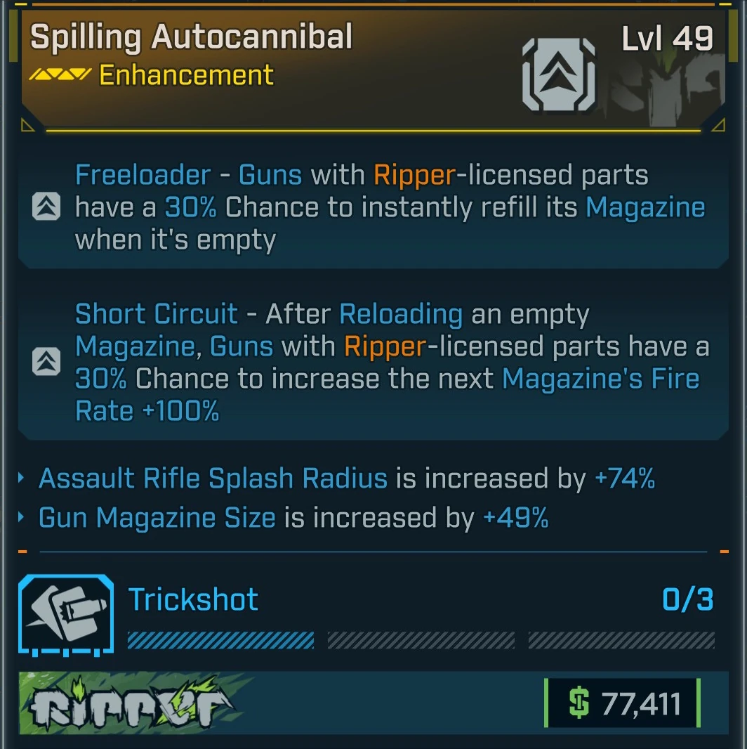 - Freeloader – Guns with Ripper-licensed parts have a 30% Chance to instantly refill its Magazine when empty.