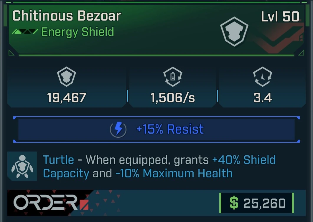 Bezoar is a common energy shield in Borderlands 4 manufactured by Order. It is obtained randomly from any suitable loot source.