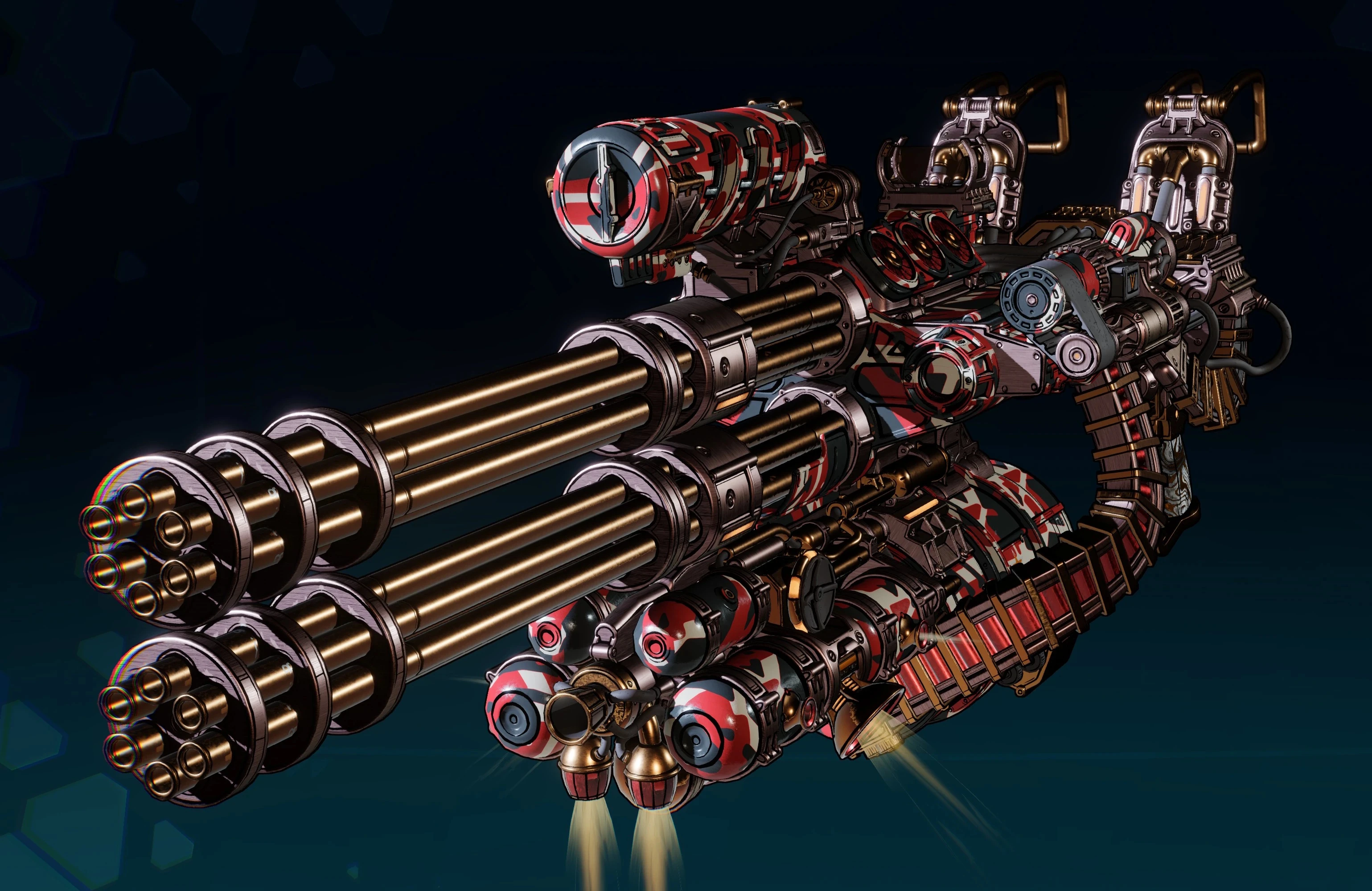 Operates as a minigun that fires a constant stream of bullets, with the fire rate increasing the longer the trigger is held.