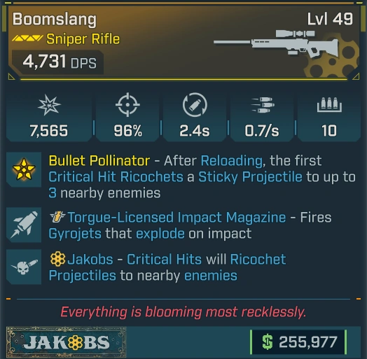 - Bullet Pollinator – After Reloading, the first Critical Hit Ricochets a Sticky Projectile to up to 3 nearby enemies.