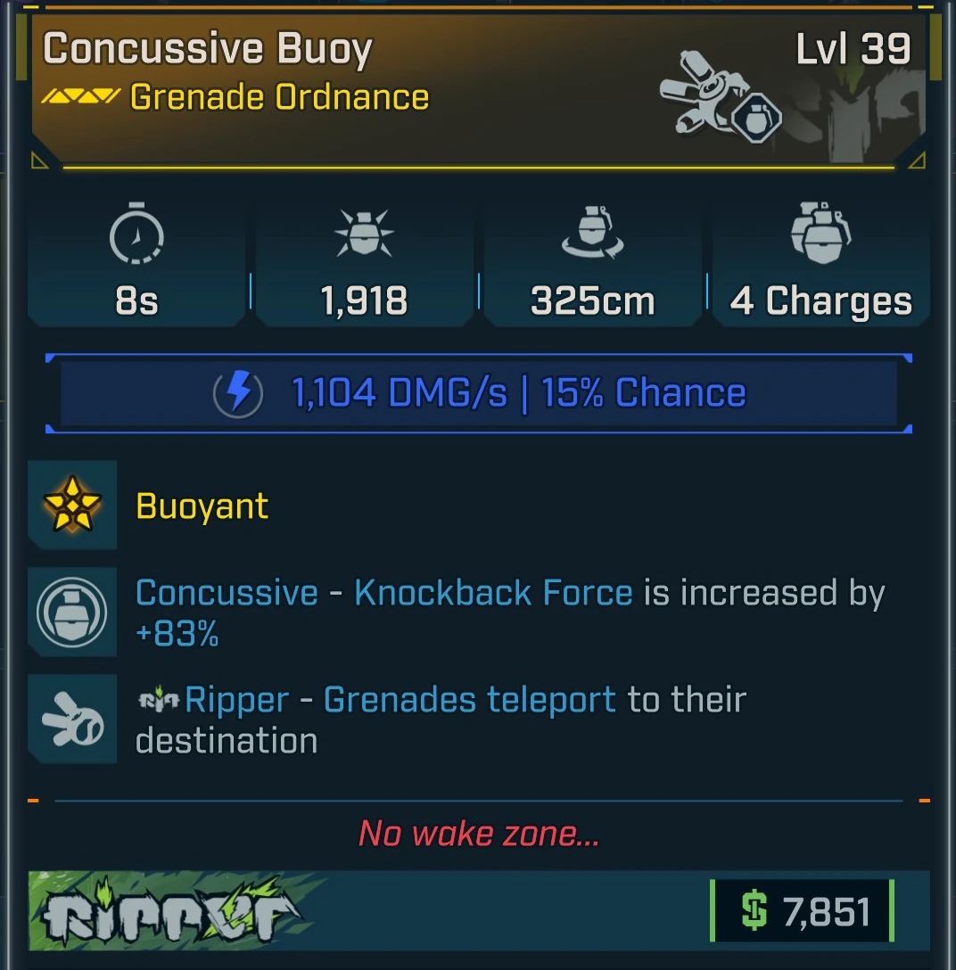 Buoy is a legendary grenade ordnance in Borderlands 4 manufactured by Ripper. It is obtained randomly from any suitable loot source, but has an increased chance to drop from Voraxis located in Timid Kyle's Neglected Opening - Auger Mine, Coastal Bonescape in The Fadefields on Kairos.