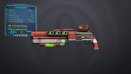 Fresh Meat! – Reduced pellet count. Greatly increased fire rate. Achieves maximum accuracy much more quickly than other Hyperion shotguns. Each time it is fired, there is a random chance for the magazine to be refilled with a random amount of ammunition. Sustained fire increases fire rate. Consumes 1 ammo per shot.