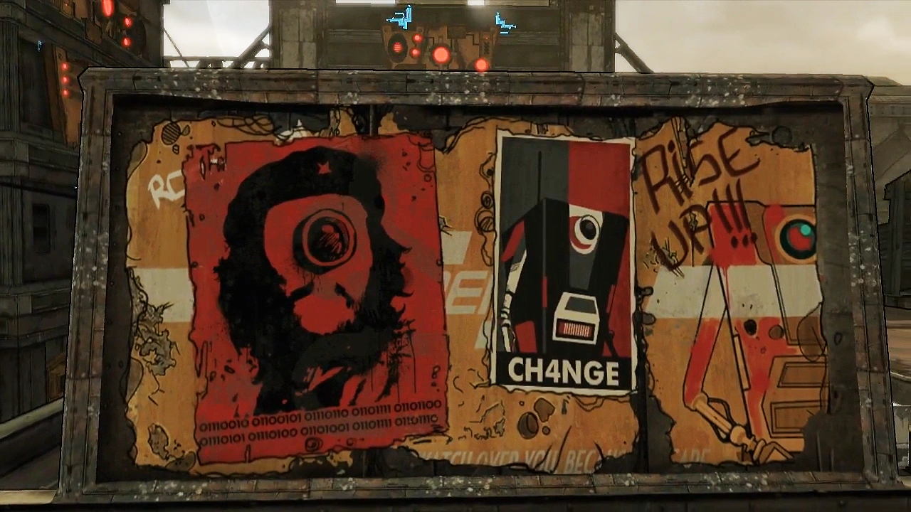 - One of the announcements is a modified version of a saying from another 2K game: "Is a claptrap not entitled to the oil of his brow? No, says the man at Hyperion, it belongs to his owner. No, says the treasure hunter, it belongs splattered on the floor. But we choose something different. We choose the Robolution!" is a reference to the opening speech made by Andrew Ryan in Bioshock.