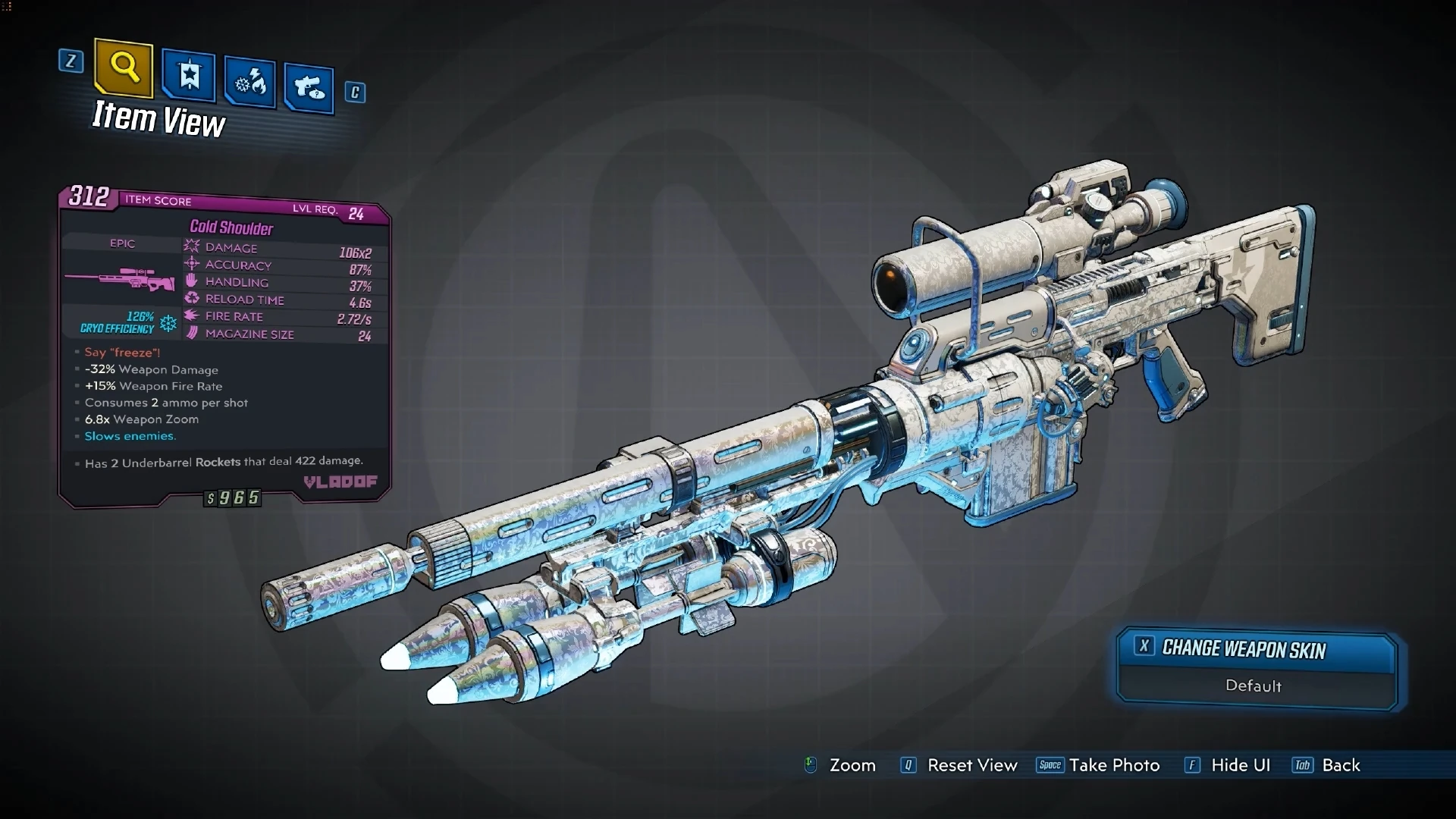 The Cold Shoulder is a relatively powerful Vladof sniper rifle that sacrifices fire rate for the ability to fire two shots at once. The shots tend to be ground close together, making it effective for sniping even at long distances with less aim sway. The underbarrel attachment allows the Cold Shoulder to stand in as both a sniper rifle and rocket launcher in one weapon slot.