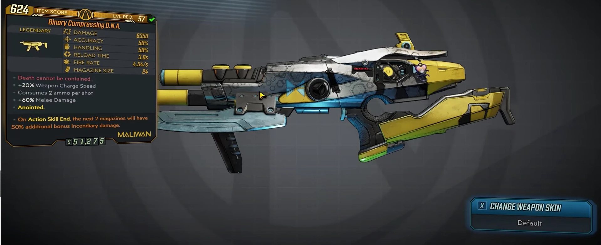 D.N.A. is a legendary submachine gun in Borderlands 3 manufactured by Maliwan. It can only be obtained from General Traunt at Mayhem 6 and above.