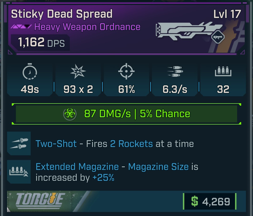 Dead Spreads is a common heavy weapon ordnance in Borderlands 4 manufactured by Torgue. It is obtained randomly from any suitable loot source.