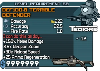 Defender is a Legendary shotgun in Borderlands manufactured by Tediore.