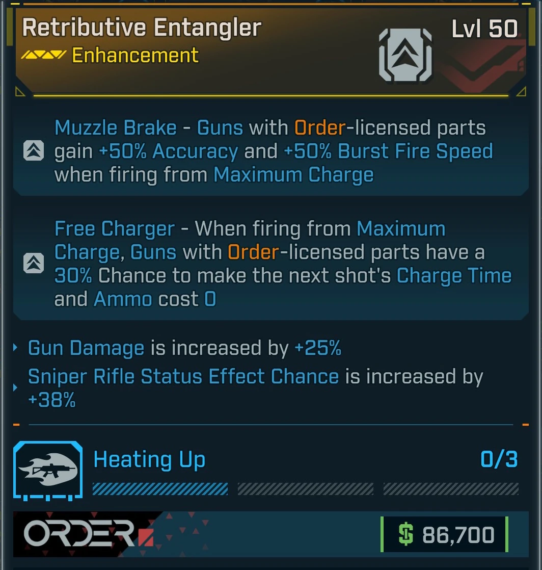 - Free Charger – Weapons with Order-licensed parts when firing from Maximum Charge have a 30% Chance to make the next shot's Charge Time and Ammo zero.