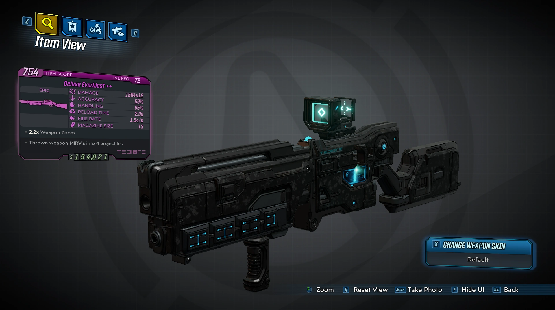 The Everblast has a chance to spawn with a MIRV Module, which causes the reloaded gun to summon multiple MIRVs upon detonation. Tediore and Leg module Everblasts will have their MIRVs explode upon contact with a surface or enemy, while the Bouncing Module will cause the MIRVs to bounce, detonating upon hitting an enemy or after a certain amount of time. The Homing module will cause the MIRVs to gain rockets and home in on targets.