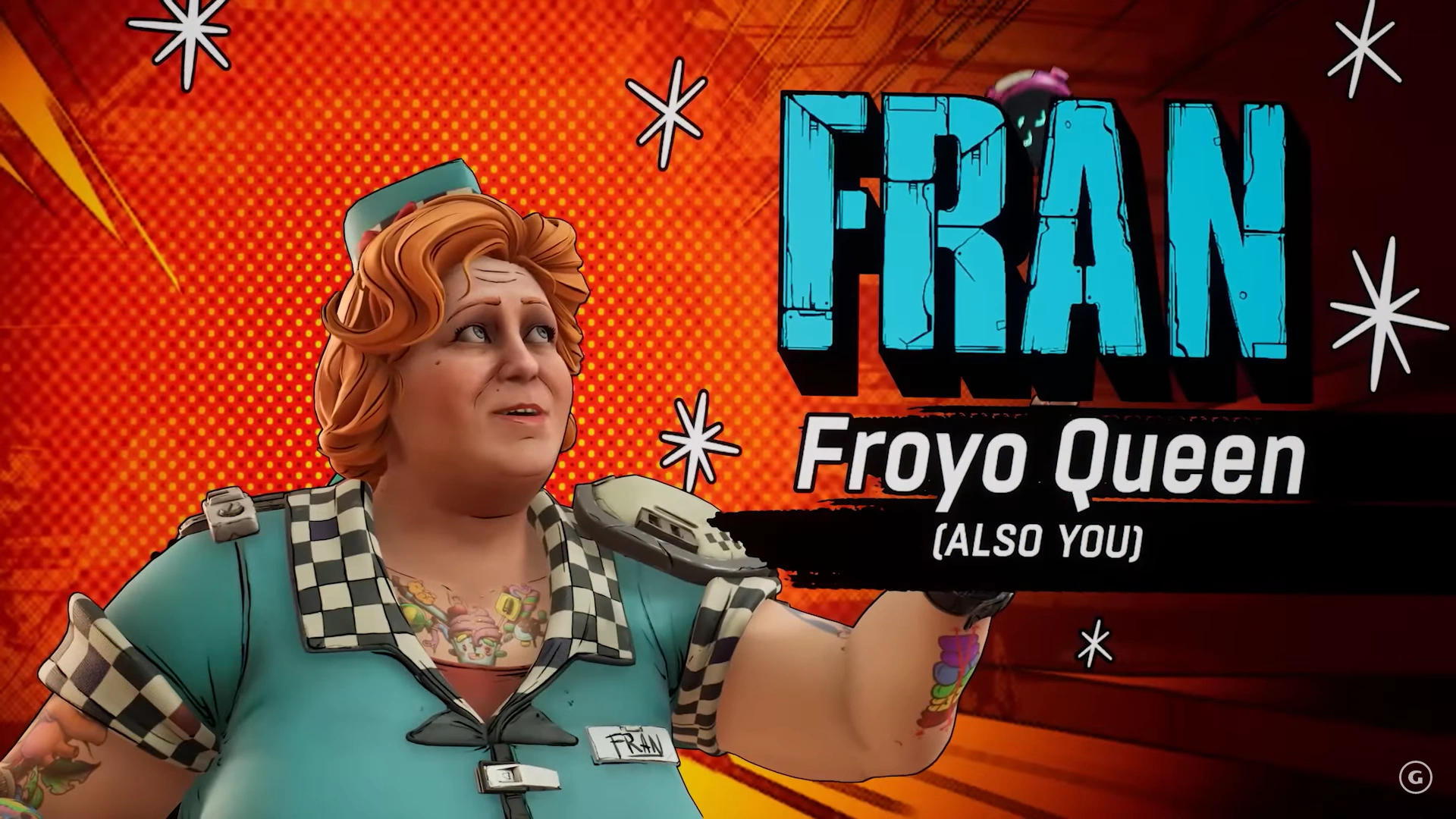Fran is owner and manager of the frogurt shop partially destroyed by a Maliwan laser during the events of Borderlands 3. She, her only other employee, Octavio, and his recently-fired sister Anu are caught in the middle of an invasion of the planet by Tediore Chairwoman Susan Coldwell.