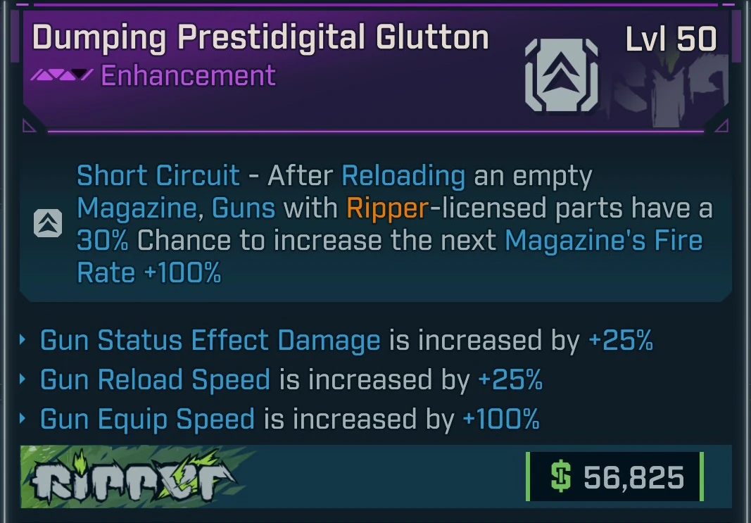 - Short Circuit – Guns with Ripper-licensed parts after reloading an empty magazine have a 30% Chance to increase the next Magazine Fire Rate 100%.