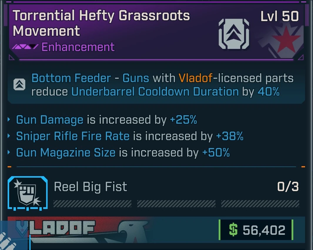 - Bottom Feeder – Weapons with Vladof-licensed parts reduce Underbarrel Cooldown Duration by 40%.