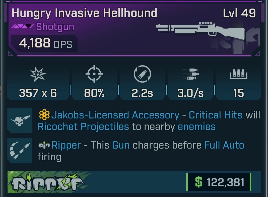 Hellhound is a common shotgun in Borderlands 4 manufactured by Ripper. It is obtained randomly from any suitable loot source.