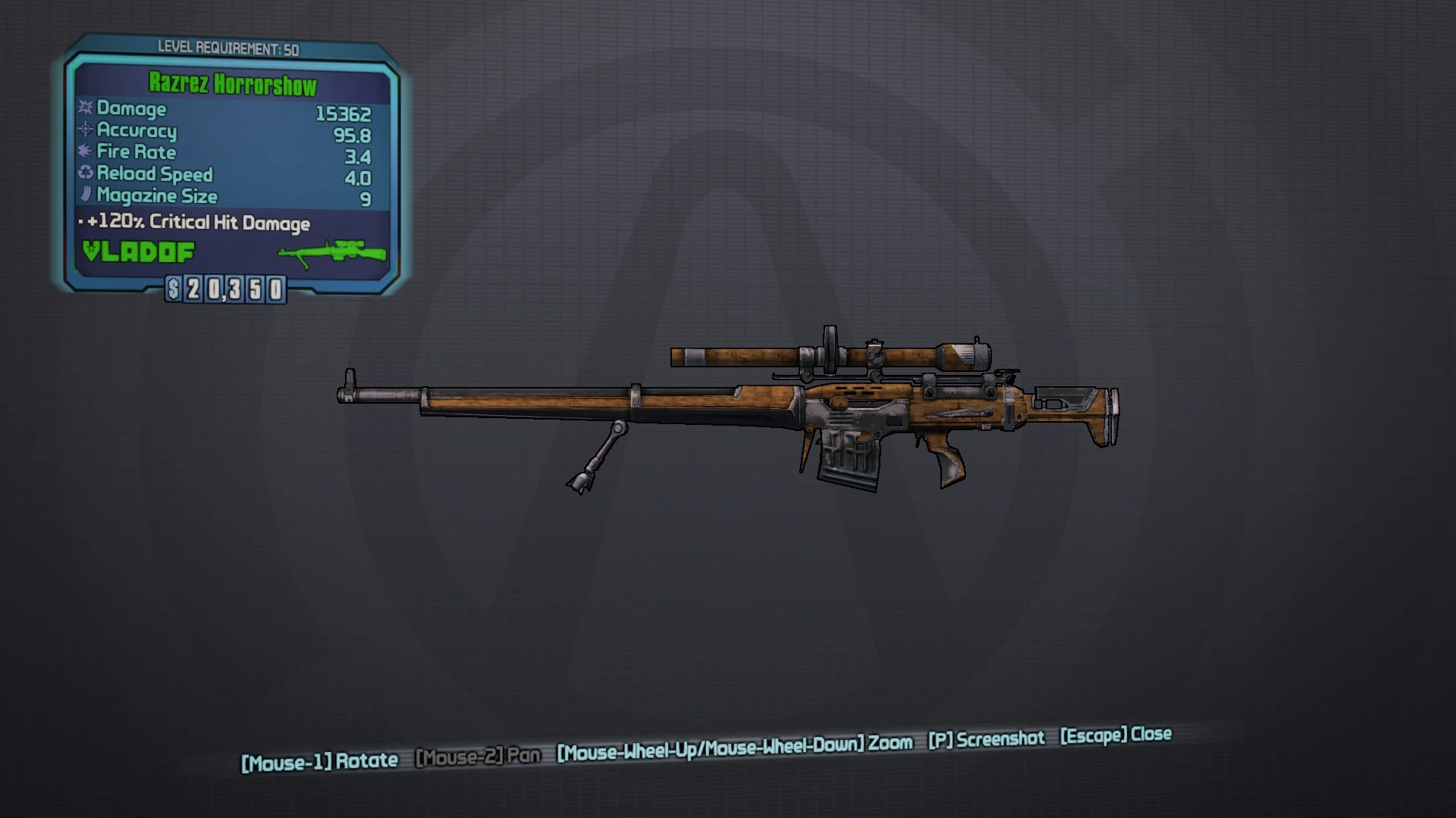 Horrorshows tend to feature fire rates lower than other Vladof sniper rifles along with moderate magazine capacity and medium recoil. Accuracy and damage are higher than the faster-firing and higher-capacity Droog, though damage is poor compared to other manufacturers' sniper rifles and reload speed is typically low.