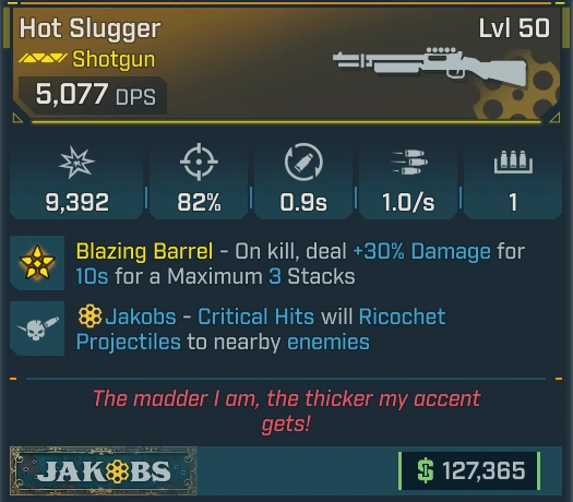 Hot Slugger is a legendary Shotgun in Borderlands 4 manufactured by Jakobs. It is obtained randomly from any suitable loot source, but has an increased chance to drop from Callous Harbinger of Annihilating Death located in Craven's Nook - Order Bunker, Heart of the Mountain in Terminus Range on Kairos.