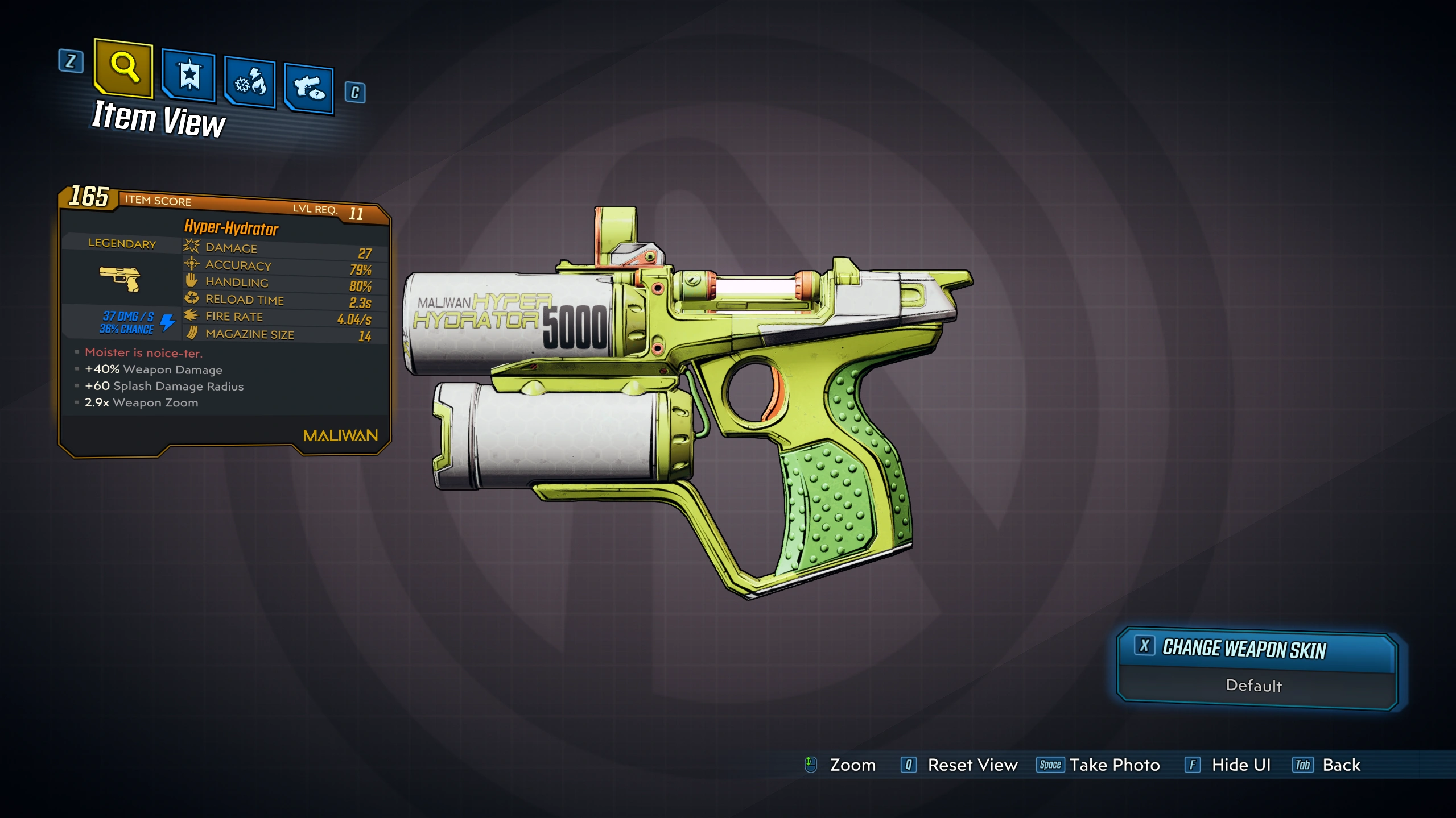 Hyper-Hydrator is a legendary pistol in Borderlands 3 manufactured by Maliwan. It is obtained from the Borderlands 3 Super Deluxe Edition or Borderlands 3 Season Pass Edition.