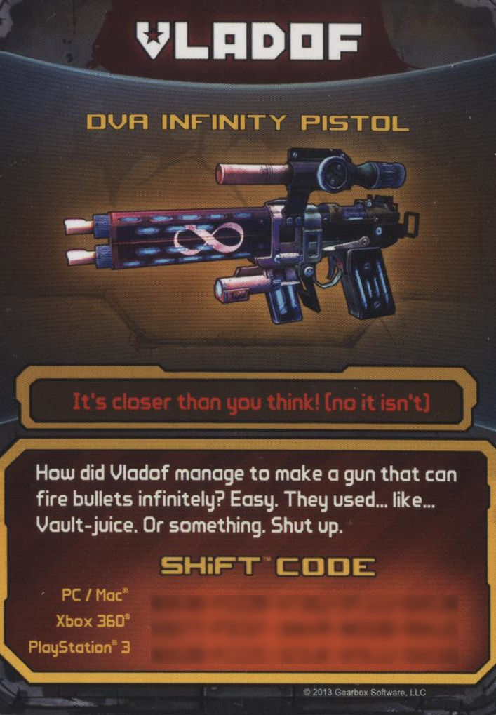 A SHiFT code which grants a single Dva Infinity was included with the Diamond Plate Loot Chest. Its card caption reads "How did Vladof manage to make a gun that can fire bullets infinitely? Easy. They used... like... Vault-juice. Or something. Shut up."