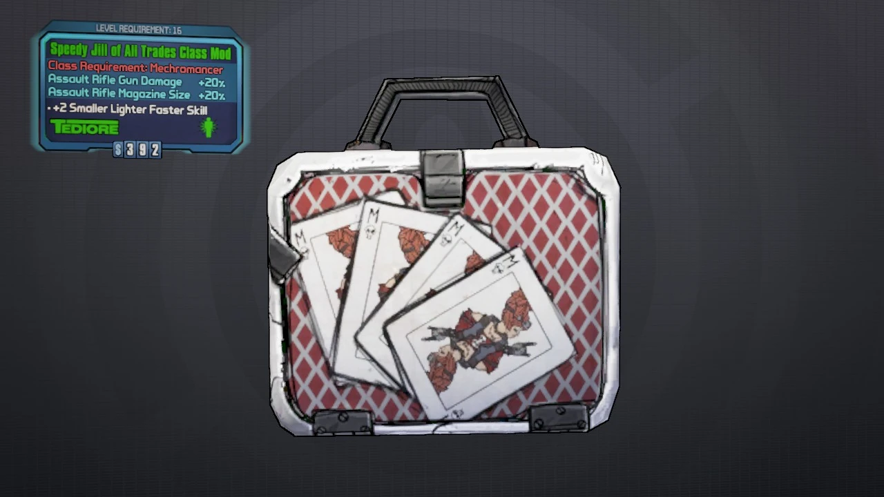 Jill of All Trades is a Common class mod for the Mechromancer manufactured by Tediore. The Jill of All Trades is obtained randomly from any suitable loot source.