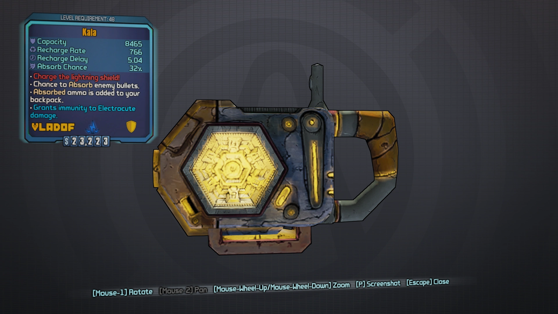 Kala is a legendary absorb shield in Borderlands: The Pre-Sequel manufactured by Vladof. It is obtained randomly from any suitable loot source.