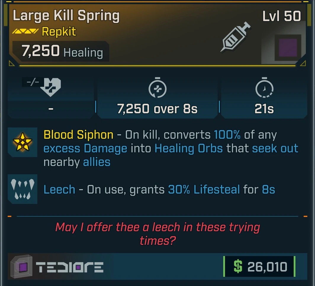 - Blood Siphon – On kill, converts 100% of any excess Damage into Healing Orbs that seek out nearby allies.