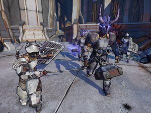 Knights are human adversaries in Tiny Tina's Assault on Dragon Keep who banded together in brotherhoods of fighters, ready to waylay adventurers in their domain. They range from light footsoldiers to heavily armoured knights, and often have long range support from archers in their ranks. On rare occasions groups of knights may also be accompanied by a Sorcerer.