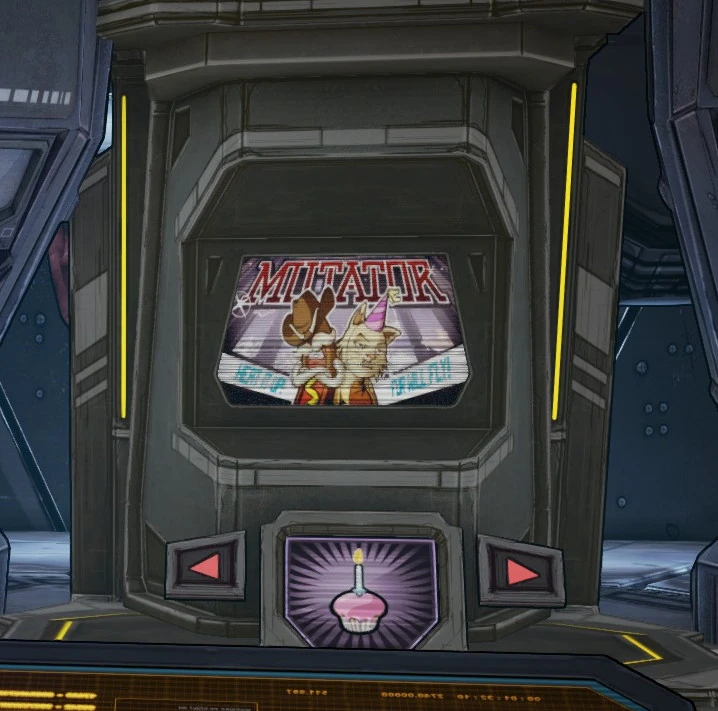 After accepting the mission, the Vault Hunters use the arrow keys on three consoles in the room to control three aspects of the arena. The icon on the front of each machine will change as the arrow keys are pressed, and the icon itself can be activated to show a description of the currently-selected option.