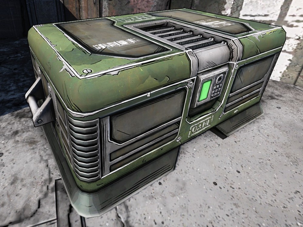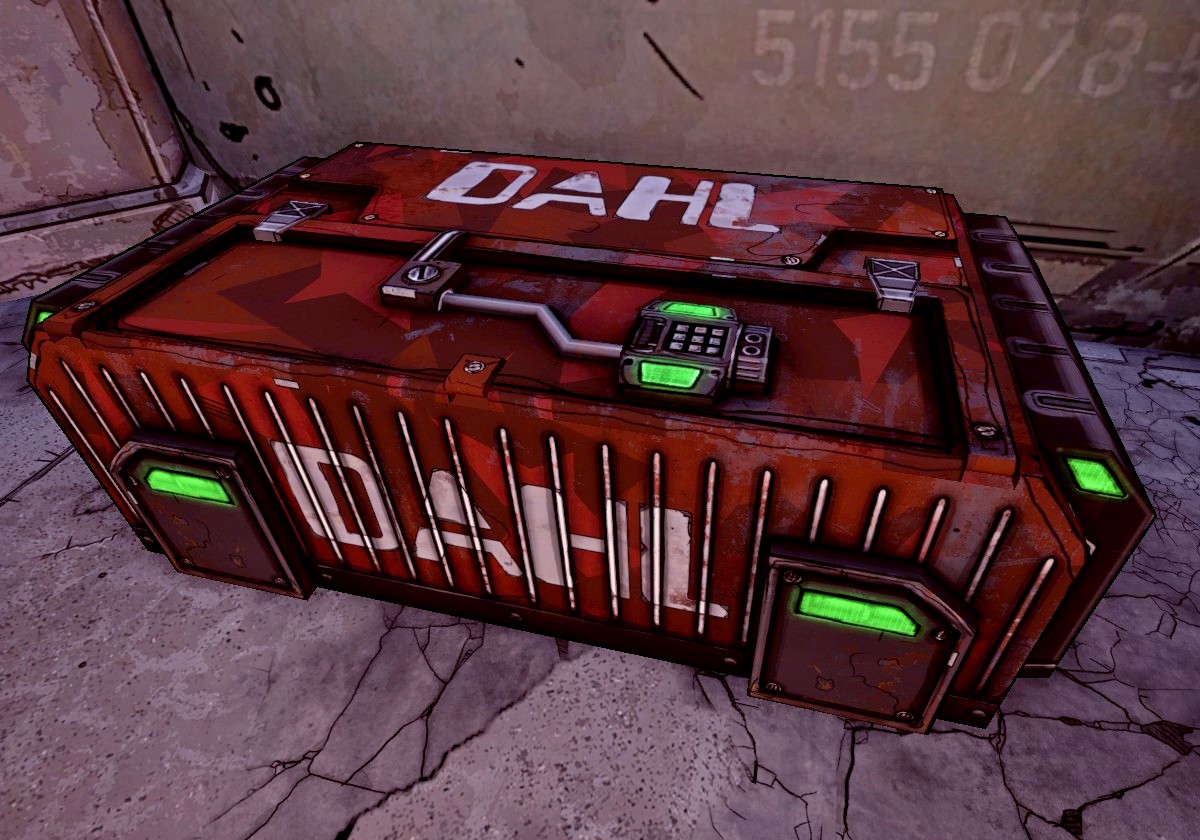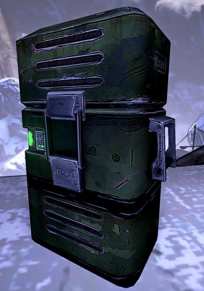 Green, rectangular containers which have the Dahl logo on the side. Usually contain a variable amount of money, though they may also contain ammo, grenades, weapons and class mods. Sometimes they're just plain empty. In The Secret Armory of General Knoxx, a Loot Midget, Dumpster Diver, is found in a dumpster.