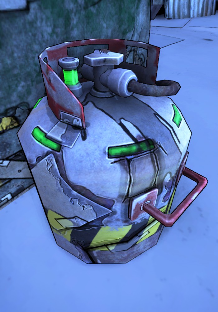 Explosive gas canisters can be found in bandit towns and camps. Shooting at it will cause it to explode dealing damage to a wide radius. Upon detonation, however, the tank can disperse ammunition, health packs, weapons, Eridium, cash, class mods and vehicle skins. Unlike its bigger kin, this will disperse less items though.
