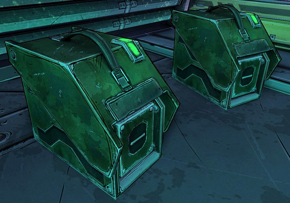 Returning from Borderlands, these smallish green crates can be found throughout Pandora. They can contain up to six ammunition packs of any sort.