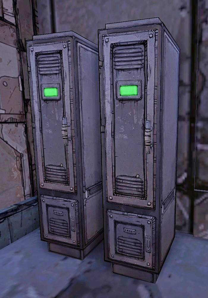 Vertical lockers, sometimes found in rows of several side-by-side. These can contain money, ammo, pistols (both repeaters and revolvers), SMGs, shields, health kits, grenade mods or class mods, with pistols ranging from white to legendary rarity.