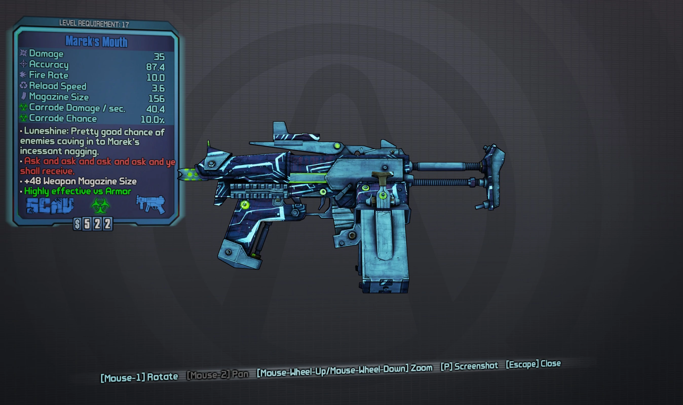 Ask and ask and ask and ask and ye shall receive. – Always corrosive. Greatly increased magazine size and fire rate. Decreased damage. Bullets fired have a chance to apply a random bonus elemental effect as well as corrosive.