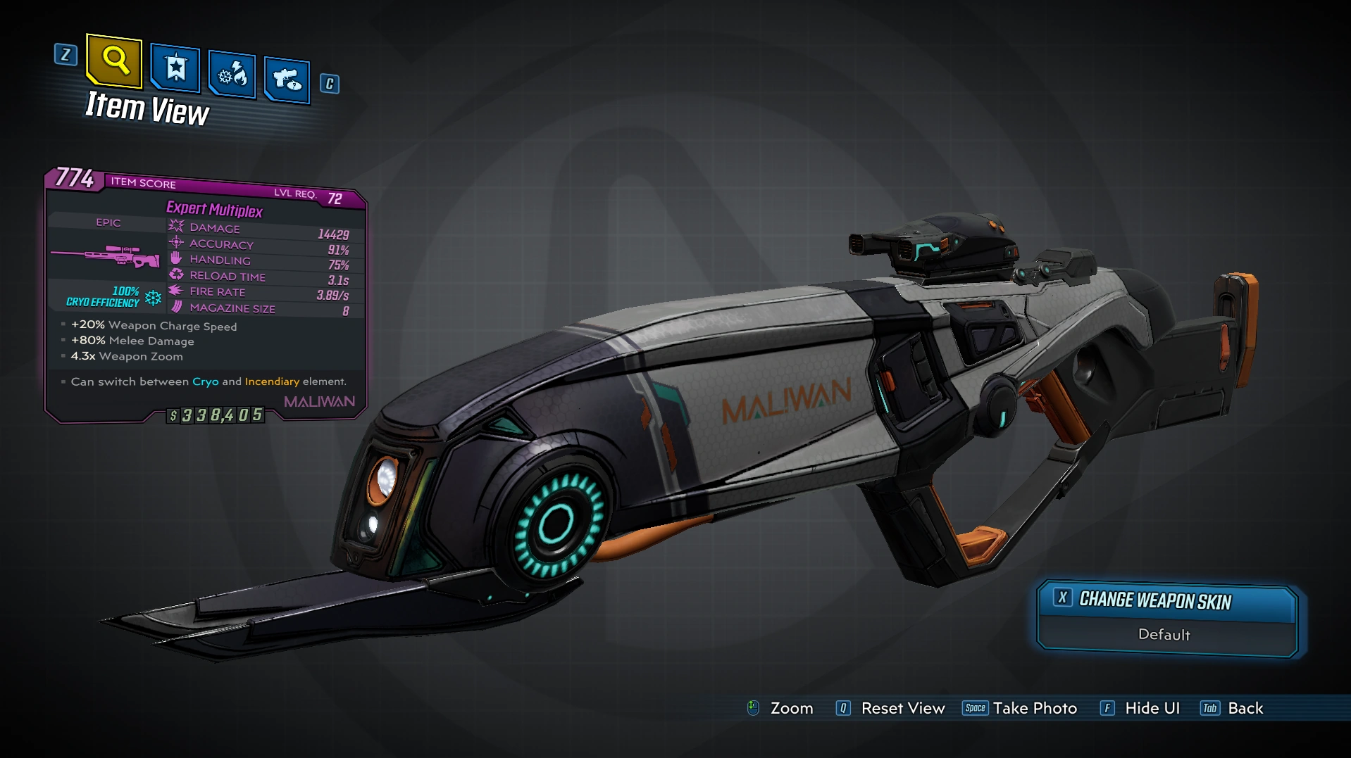 The Multiplex is a fully automatic Maliwan sniper rifle. It has a higher rate of fire than other Maliwan sniper rifle, and begins firing as soon as it's charged. It can also have a melee accessory that provide +80% melee damage.