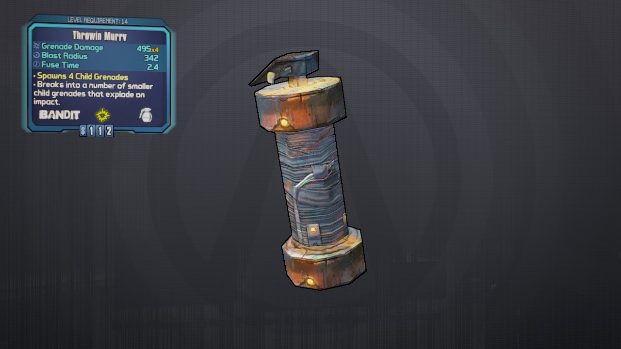 Murrv is a common Grenade Mod in Borderlands 2, manufactured by Bandit. It is obtained randomly from any suitable loot source.