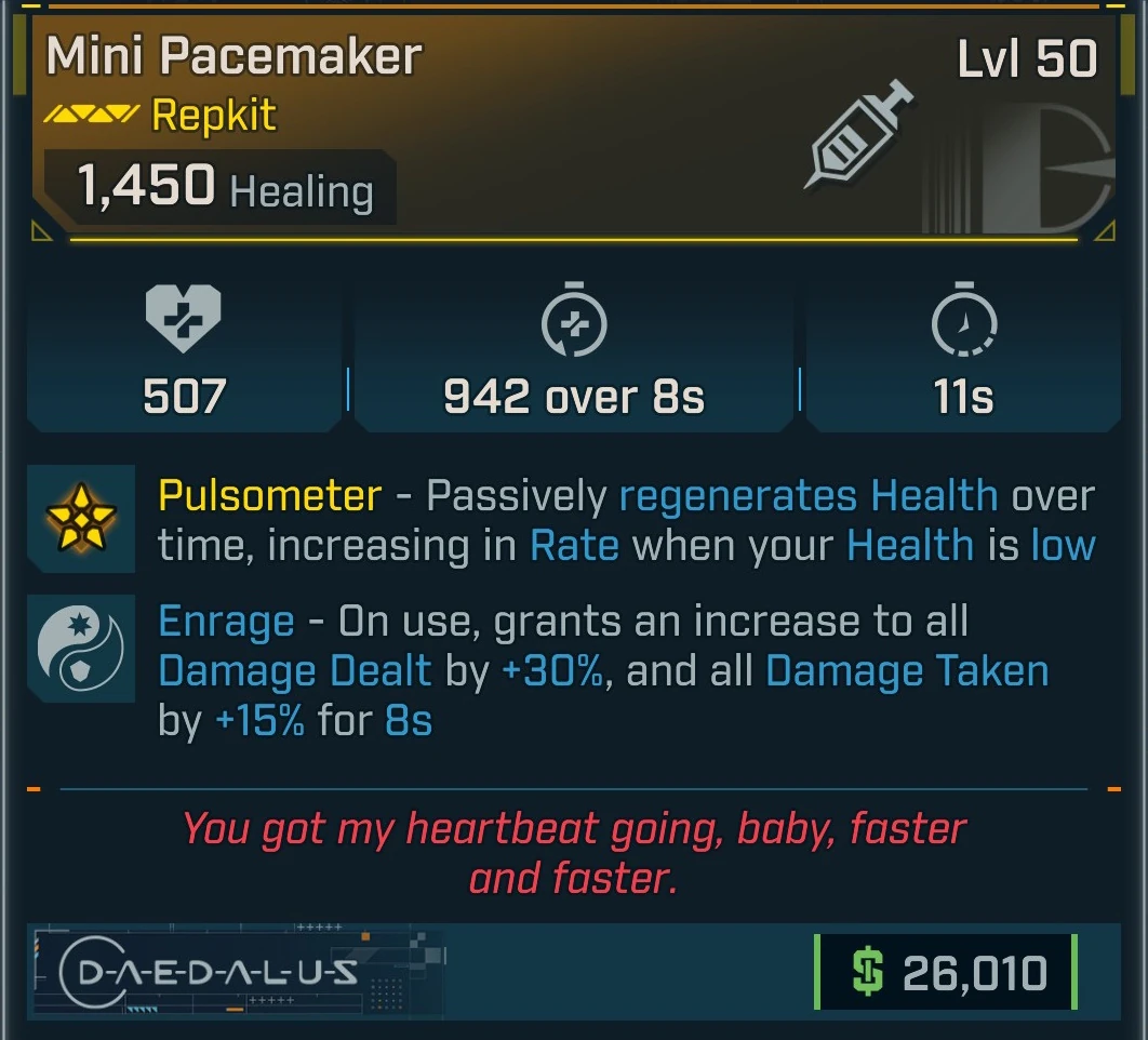 Pacemaker is a legendary Repkit in Borderlands 4 manufactured by Daedalus. It is obtained randomly from any suitable loot source, but has an increased chance to drop from Horace located in Horace's Oversight on the Hungering Plain in the Fadefields.