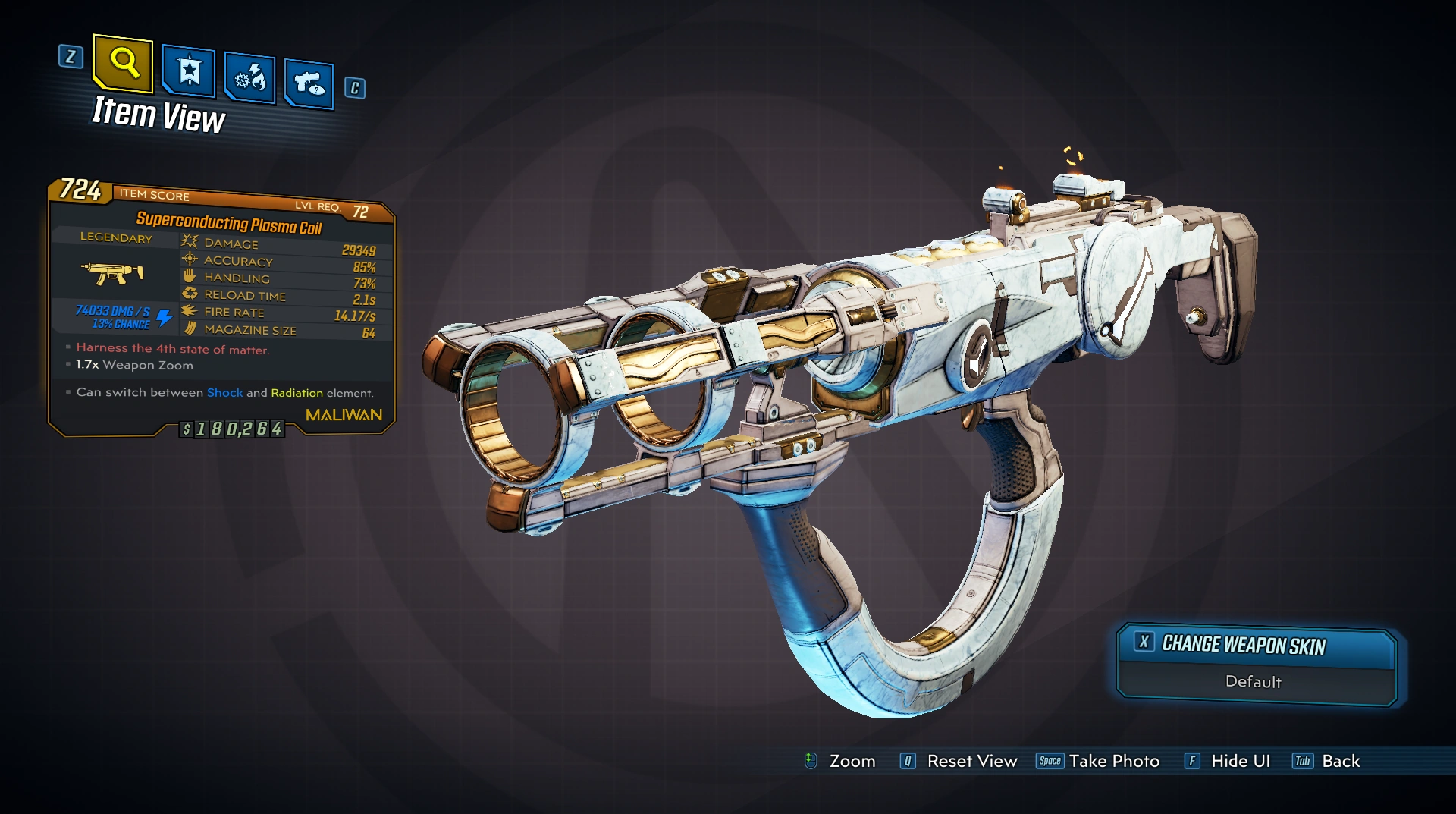 Plasma Coil is a legendary submachine gun in Borderlands 3 manufactured by Maliwan, and is exclusive to the Designer's Cut DLC. It is obtained randomly from any suitable loot source at Stormblind Complex (with an increased chance to drop in Madwidth Power) during the Arms Race mode, and can be brought outside of the area when extracted with a Gear Extractor.