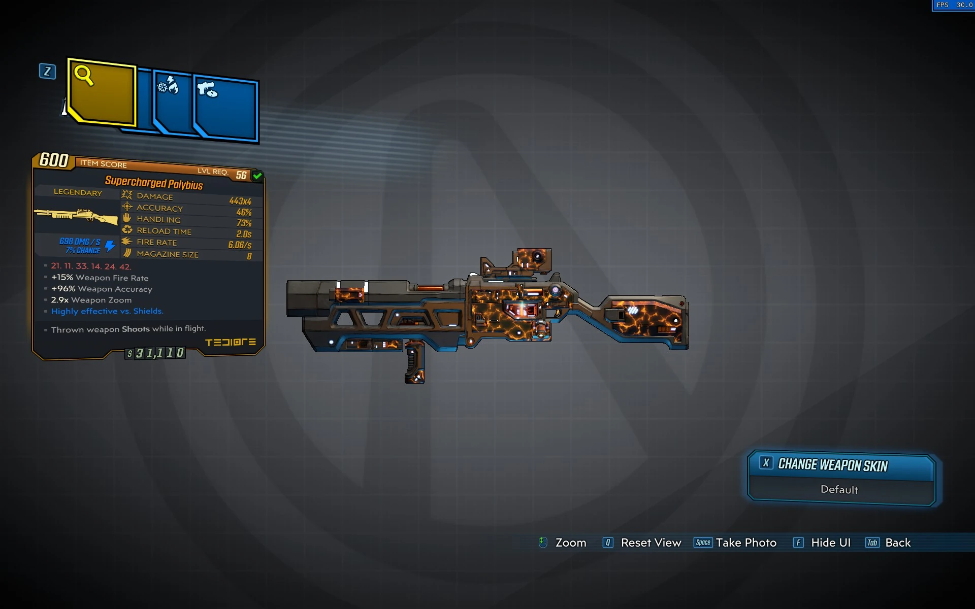 | 56 | Supercharged | 443 (×4) | 46% | 6.06/s | 2.0s | 8 | 698 7% | +15% Weapon Fire Rate +96% Weapon Accuracy 2.9x Weapon Zoom Thrown weapon Shoots while in flight |
