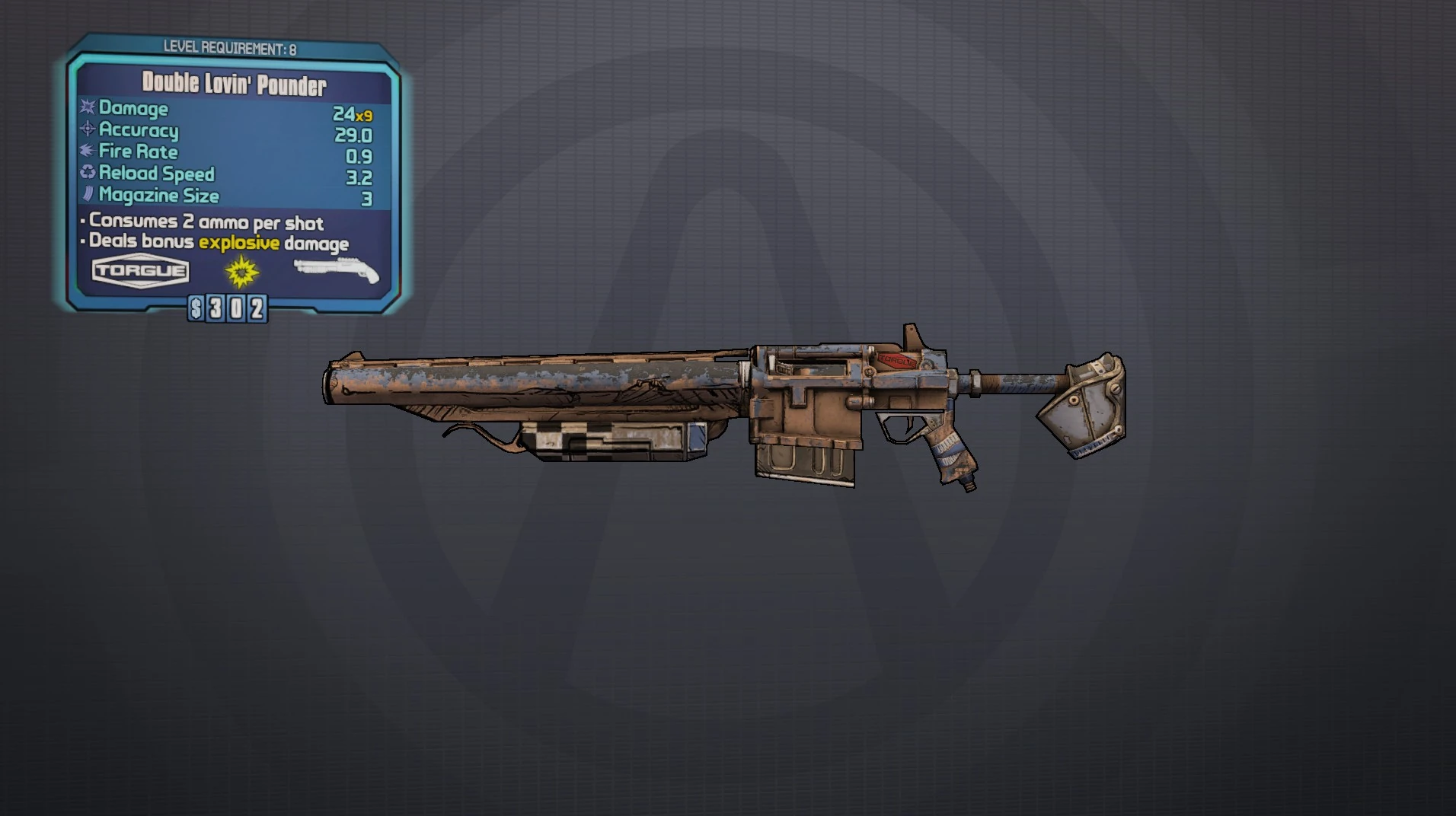 As the Pounder fires from a double barrel, it has an increased pellet count that comes at the cost of ammo consumption, recoil, and accuracy. It is a decent Torgue shotgun available early in the game, but is easily outperformed by the Hulk and Ravager which unlike the Pounder, are not available in white rarity.