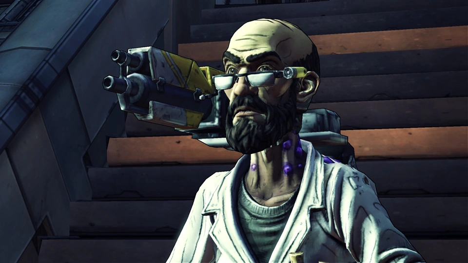 Professor Nakayama is the primary antagonist of Sir Hammerlock's Big Game Hunt. He is a small, wiry man with a multitude of Eridium fragments protruding from his skin, and has enhanced himself further by grafting on a robotic weapon appendage protruding from his back and over his right shoulder.