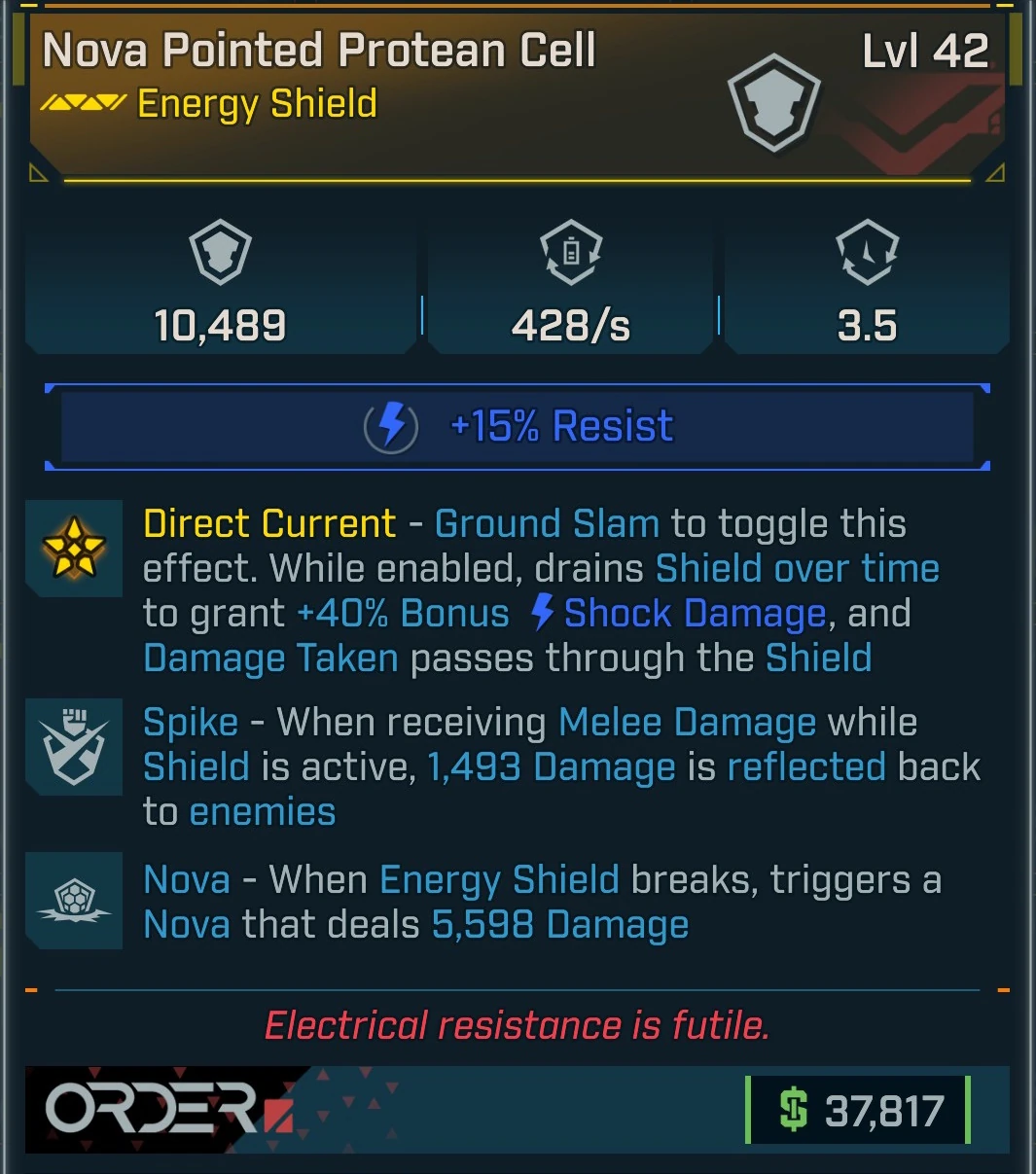 Direct Current – Ground Slam to toggle this effect. When enabled, drains Shield over time to grant 40% bonus Shock Damage, and Damage received passes through the Shield.