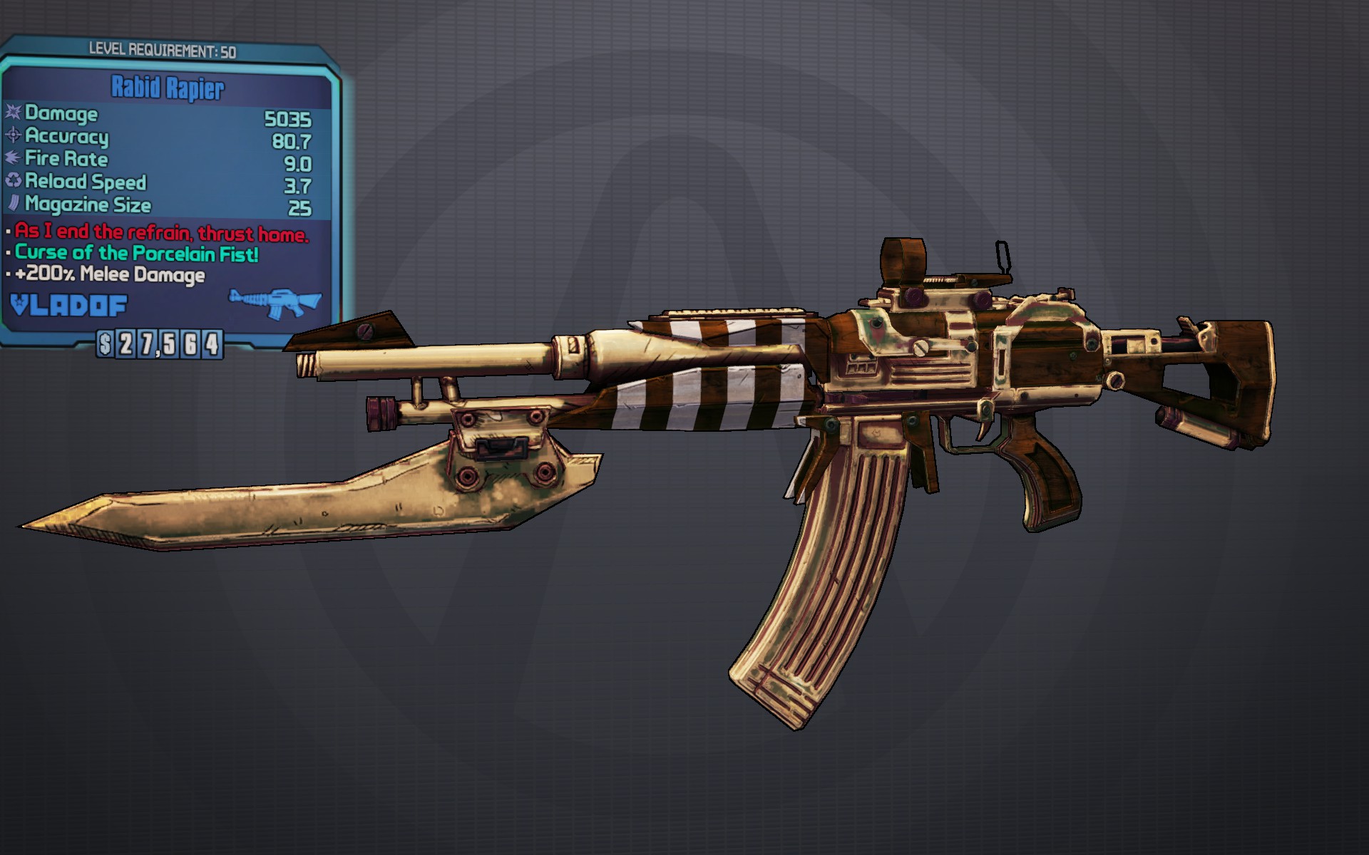 The Rapier has the highest melee damage modifier in the game but has much lower gun damage than similar quality assault rifles, making it redundant in the latter regard to most weapons (a Slag variant may still be useful to increase damage even further). It is a good choice for melee-focused characters such as Zer0 with a Bloodshed build. The drawback is something that can be easily managed, as incoming melee attacks can be easily avoided, and bullet damage to the user is not increased.
