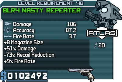 Repeater Pistols are a type of pistol with low or medium rates of fire. Repeater pistols have greater accuracy, lower recoil and higher base damage compared to Machine Pistols. Repeaters are best used by players that prefer to aim for critical hits rather than a spray and pray play style. Compared to machine pistols, the drawback of repeaters is lower damage per second due to its slower rate of fire, assuming all shots land on target.