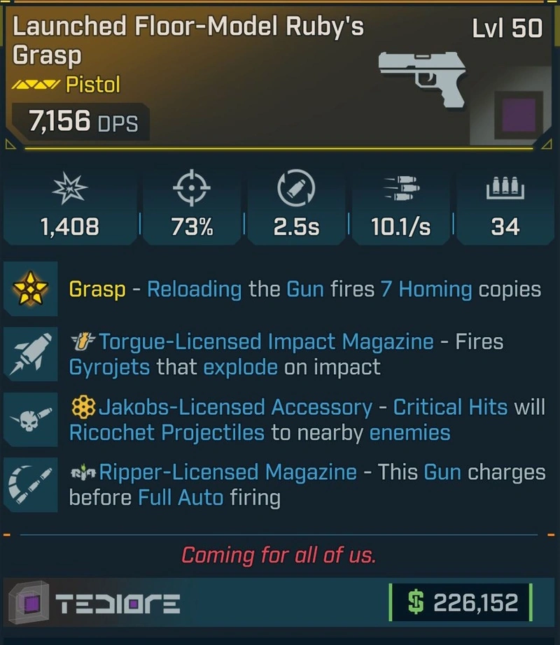 Ruby's Grasp is a legendary pistol in Borderlands 4 manufactured by Tediore. It has a chance to drop from Vile Lictor in Umbral Foundry in Terminus Range.