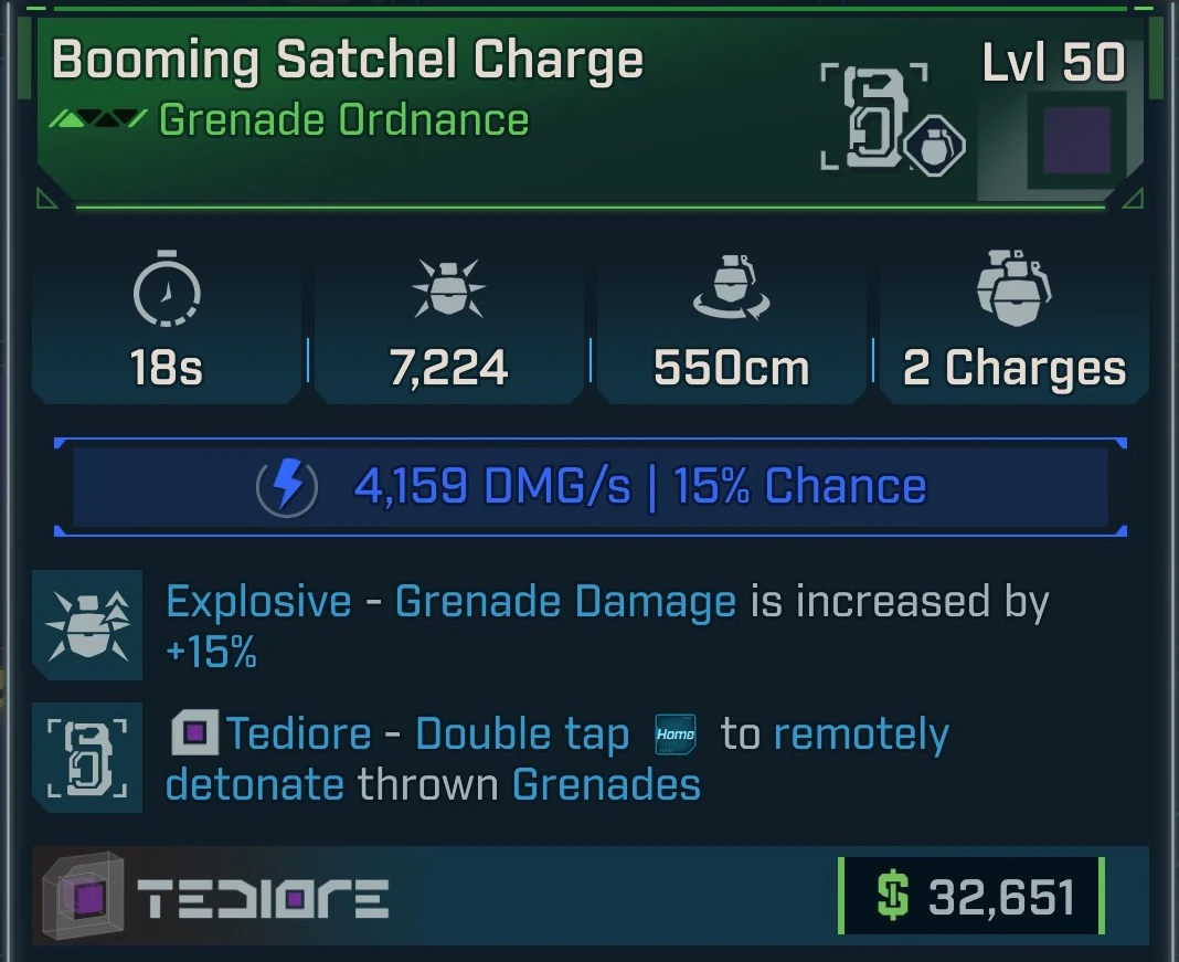 Satchel Charge is common grenade ordnance in Borderlands 4 manufactured by Tediore. It is obtained randomly from any suitable loot source.
